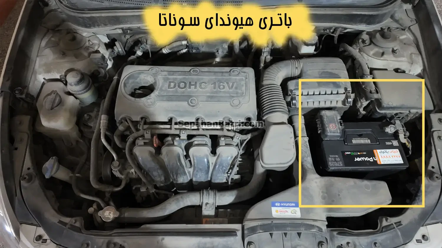 باتری هیوندای سوناتا در کاپوت جلو سمت راننده قرار دارد.