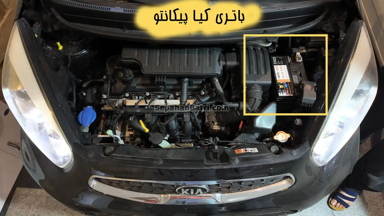 باتری کیا پیکانتو در قسمت پیشرانه این خودرو قرار دارد. در شکل زیر میتوانید محل باتری کیا پیکانتو را مشاهده کنید.